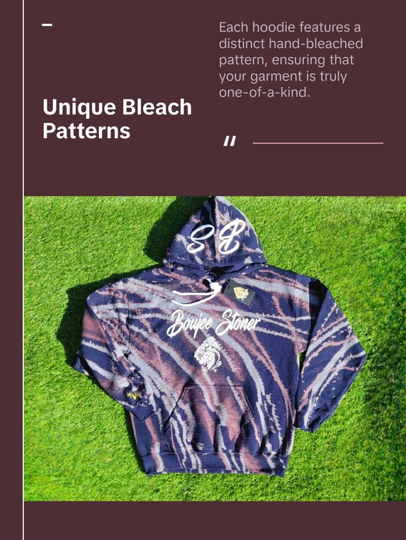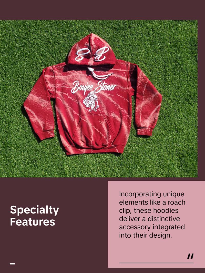 Boujee Stoner Bleached Hoodies Show off your Boujee Stoner style with our bleached hoodies! These hoodies are made from high-quality cotton and are hand-bleached to create a unique and one-of-a-kind look, PEEP the Roach Clip!!!
